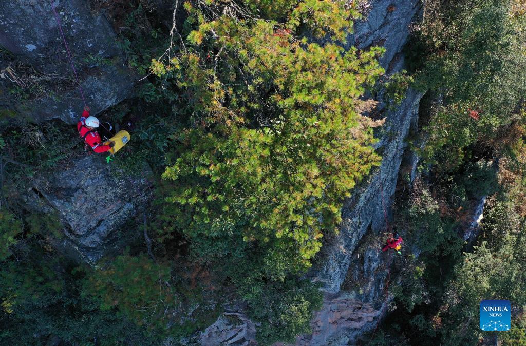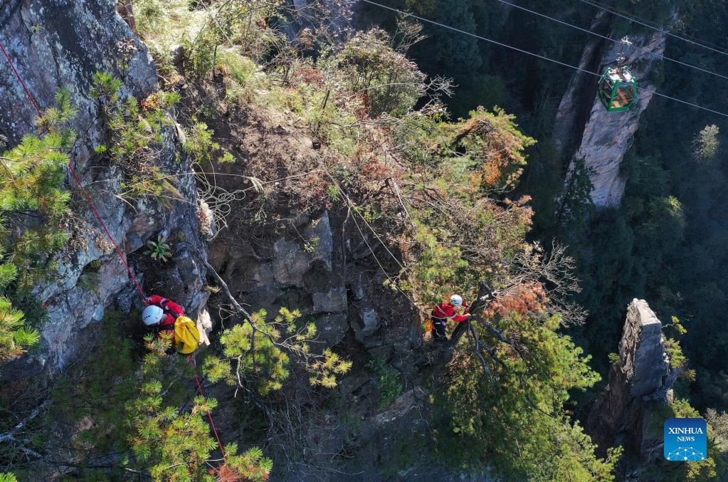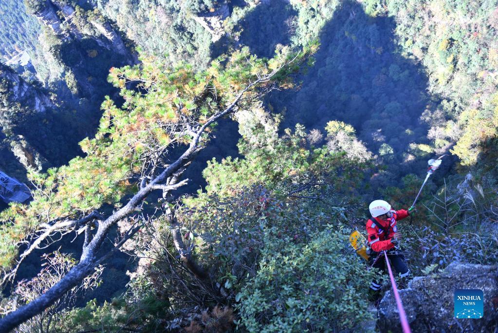 An emergency rescue team member rappels down a cliff to collect litters during an emergency drill at Huangshizhai Village of Wulingyuan, Zhangjiajie, central China's Hunan Province, Nov. 10, 2021. Members of this non-profit organization regularly collect litters from precipitous cliffs in and around Wulingyuan, a scenic site on the World Natural Heritage List of UNESCO. (Xinhua/Zhao Zhongzhi)