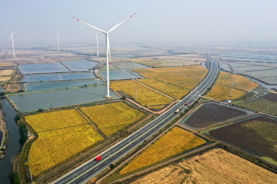 Aerial photo taken on Nov. 3, 2021 shows a wind power field in Luduo Township of Baoying County of Yangzhou, east China's Jiangsu Province. (Xinhua/Li Bo)