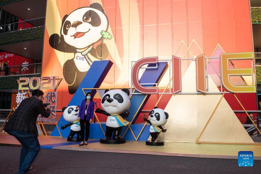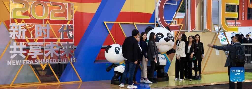 Visitors take photos with Jinbao, mascot of the China International Import Expo (CIIE) in east China's Shanghai, Nov. 5, 2021. The 4th CIIE concluded here on Wednesday. (Xinhua/Jin Liwang)