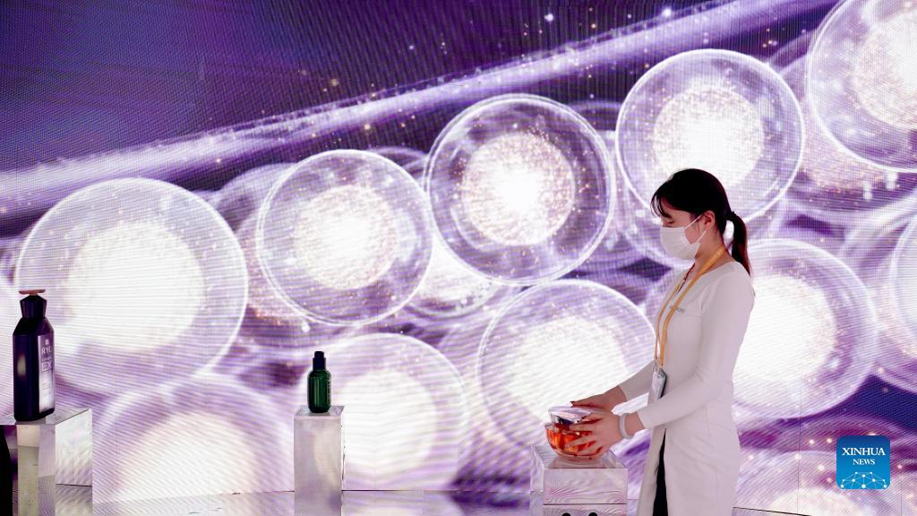 A staff member shows newly-launched products at the Consumer Goods Exhibition Area of the 4th China International Import Expo (CIIE) in east China's Shanghai, Nov. 8, 2021. The 4th CIIE concluded here on Wednesday. (Xinhua/Liu Ying)