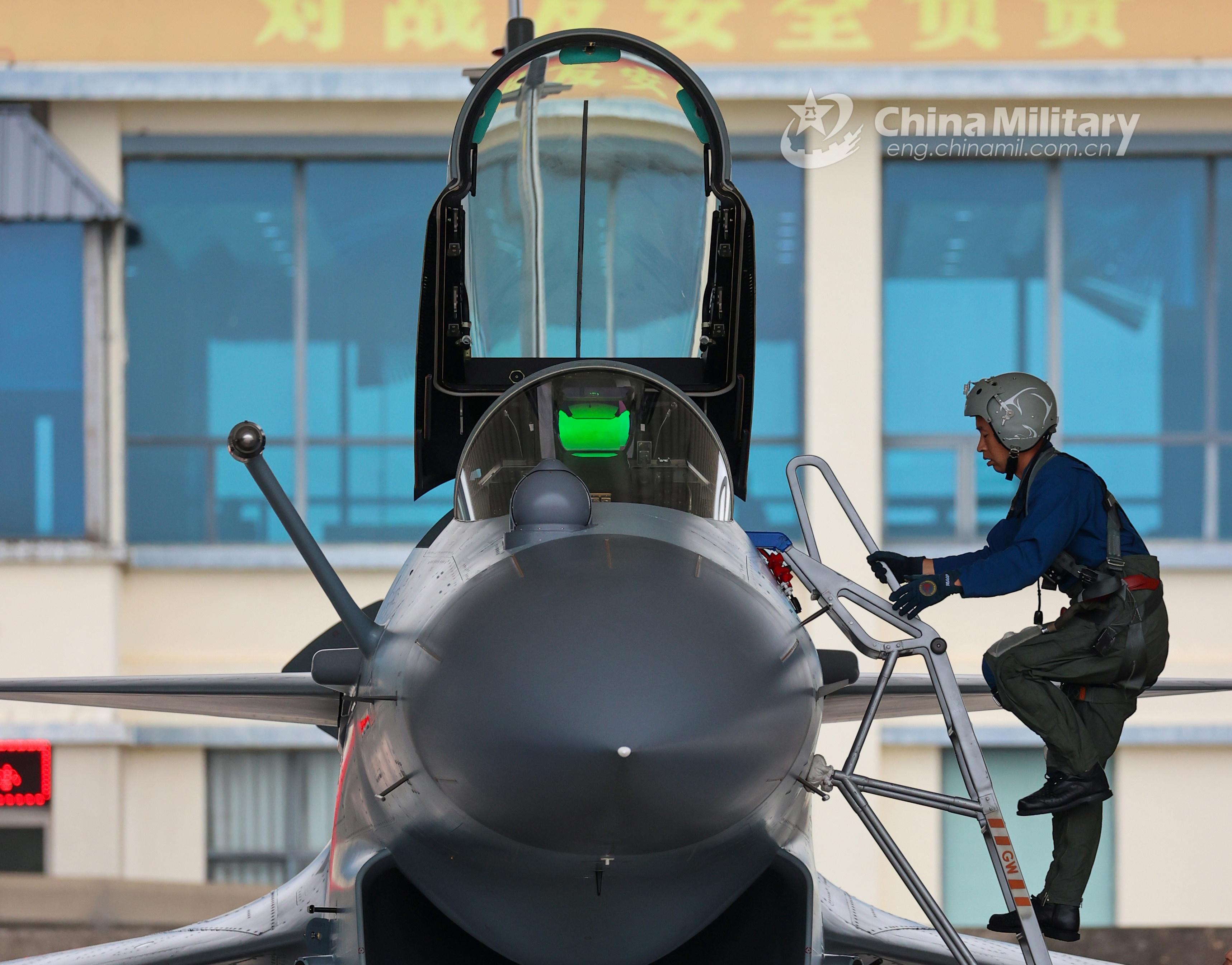 A pilot assigned to an aviation brigade of the air force under the PLA Southern Theater Command climbs into the cockpit of his J-10 fighter jet during a flight training exercise on October 11, 2021. (eng.chinamil.com.cn/Photo by Wang Guoyun)