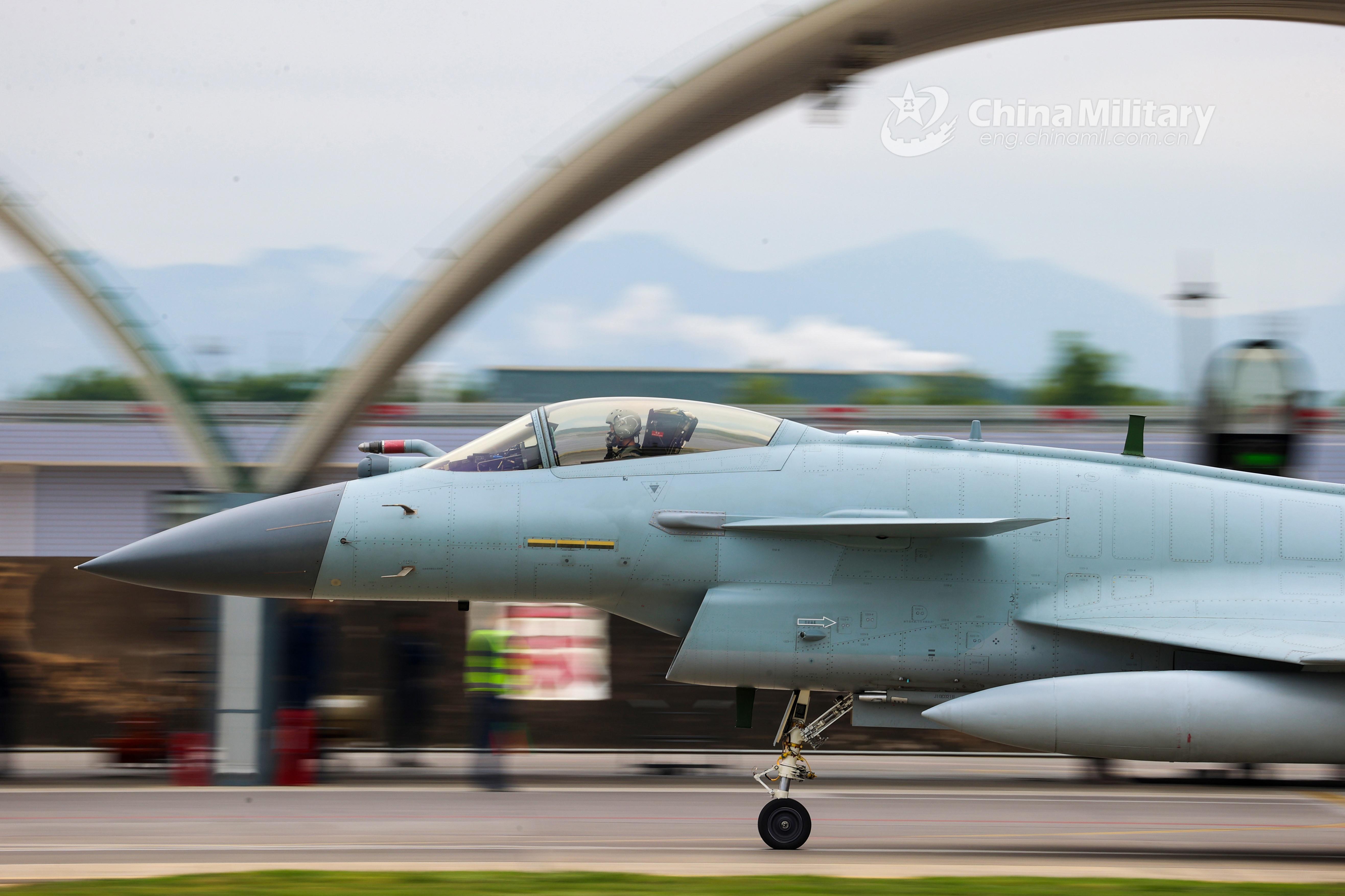 A J-10 fighter jet attached to an aviation brigade of the air force under the PLA Southern Theater Command taxies in speed before takeoff during a flight training exercise on October 11, 2021. (eng.chinamil.com.cn/Photo by Wang Guoyun)