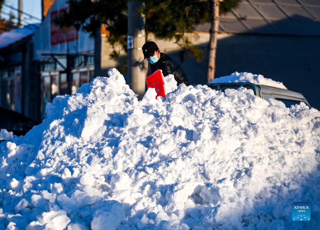 A resident removes snow in Kailu County of Tongliao, north China's Inner Mongolia Autonomous Region, Nov. 10, 2021. Cities of Tongliao and Chifeng in north China's Inner Mongolia have been walloped by strong snowstorms recently. The snow removing operations have been carried out by local governments to resume transportation as well as agricultural and husbandry production. (Xinhua/Lian Zhen)
