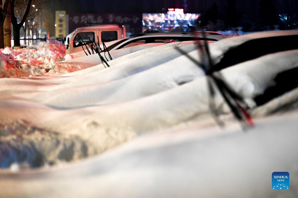Cars covered by snow are seen in Tongliao, north China's Inner Mongolia Autonomous Region, Nov. 10, 2021. Cities of Tongliao and Chifeng in north China's Inner Mongolia have been walloped by strong snowstorms recently. The snow removing operations have been carried out by local governments to resume transportation as well as agricultural and husbandry production. (Xinhua/Liu Lei)