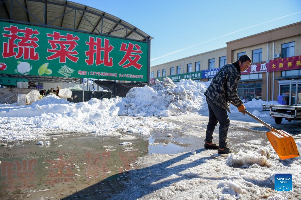 A staff member cleans snow at a wholesale market in Tongliao, north China's Inner Mongolia Autonomous Region, Nov. 11, 2021. Tongliao City in north China's Inner Mongolia has been walloped by the strongest snowstorm ever recorded. Faced with the recent cold weather and snowstorms, the local authorities have launched an emergency program to ensure transportation safety, power supply as well as agricultural and husbandry production, guaranteeing people's normal life. (Xinhua/Lian Zhen)