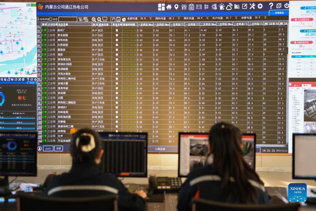 Staff members work at a thermal power company in Tongliao, north China's Inner Mongolia Autonomous Region, Nov. 11, 2021. Tongliao City in north China's Inner Mongolia has been walloped by the strongest snowstorm ever recorded. Faced with the recent cold weather and snowstorms, the local authorities have launched an emergency program to ensure transportation safety, power supply as well as agricultural and husbandry production, guaranteeing people's normal life. (Xinhua/Liu Lei)