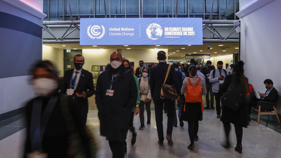People participate in the ongoing 26th session of the Conference of the Parties (COP26) to the United Nations Framework Convention on Climate Change in Glasgow, Scotland, the United Kingdom, Nov. 9, 2021. (Xinhua/Han Yan)