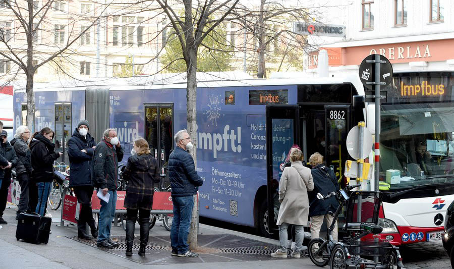 People wait to receive vaccines at a COVID-19 vaccination bus in Vienna, Austria, Nov. 10, 2021. (Xinhua/Guo Chen)