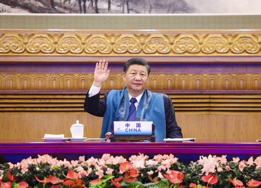 Chinese President Xi Jinping addresses the 28th Asia-Pacific Economic Cooperation (APEC) Economic Leaders' Meeting via video link, in Beijing, capital of China, Nov. 12, 2021. (Xinhua/Li Xiang)