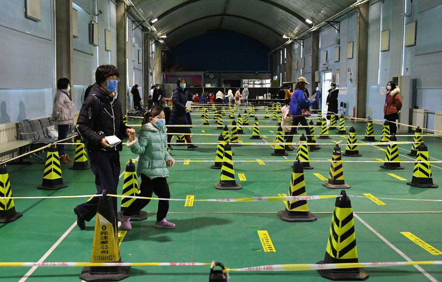 Parents and their children are seen as they arrive to receive COVID-19 vaccine at a vaccination site in Haidian District of Beijing, capital of China, Nov. 13, 2021. (Xinhua/Ren Chao)