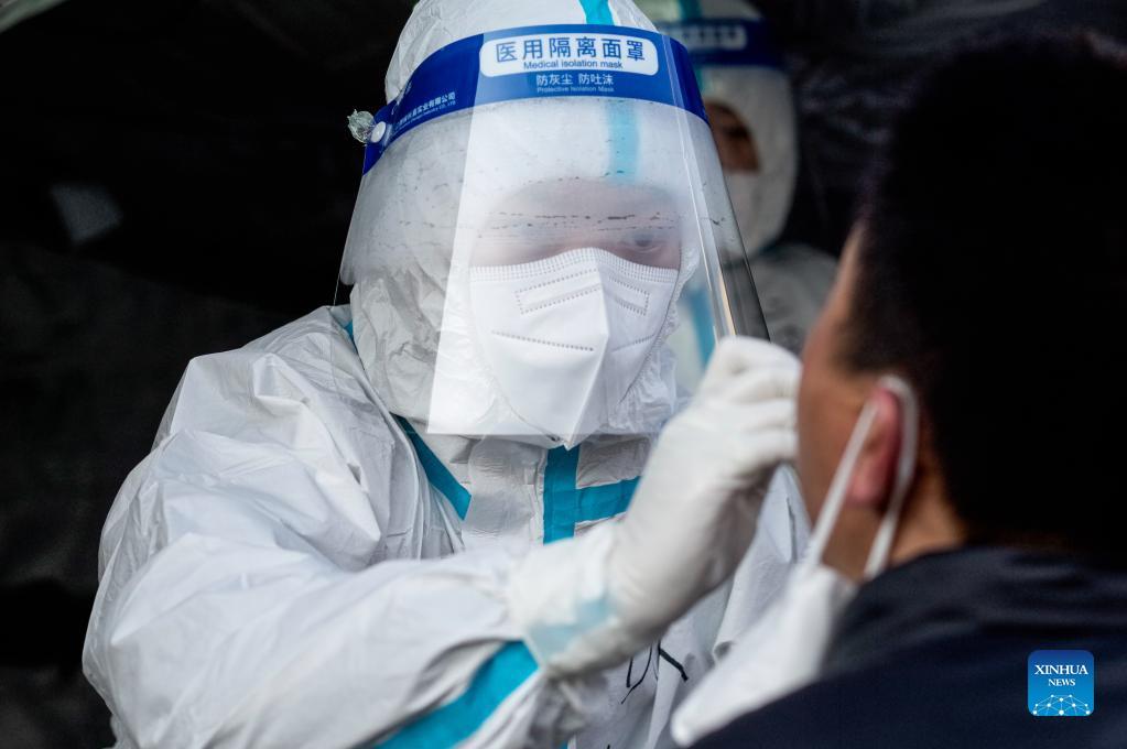 A medical worker takes a swab sample from a citizen for nucleic acid test at a testing site in Xining, northwest China's Qinghai Province, Nov. 8, 2021. Xining started its second round of mass nucleic acid testing at 9 a.m. on Monday. As of Nov. 7, Xining finished the first round of testing, and all swab samples from 1,448,000 citizens came back negative. (Xinhua/Wu Gang)