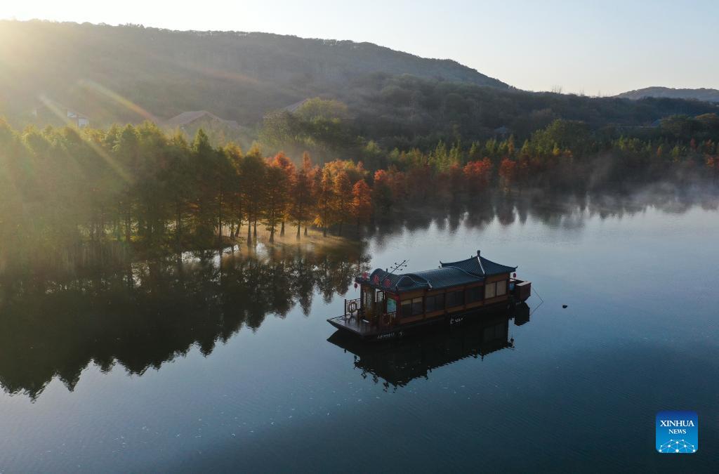 Aerial photo taken on Nov. 14, 2021 shows a winter landscape of Tianquan Lake in Xuyi County, east China's Jiangsu Province. (Xinhua/Ji Chunpeng)