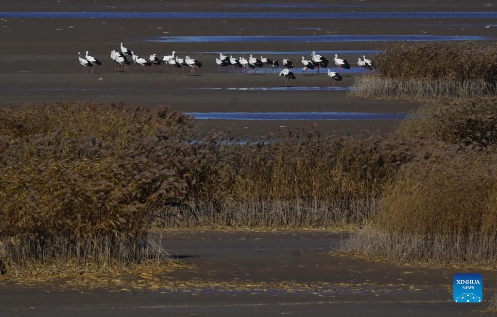 A flock of oriental white storks forage during their southward migration at Caofeidian wetland in Tangshan, north China's Hebei Province, Nov. 14, 2021. The Caofeidian wetland, located in the city of Tangshan, is an important spot for the migratory bird species which is under first-class national protection and is listed as "endangered" by the International Union for Conservation of Nature. (Xinhua/Yang Shiyao)