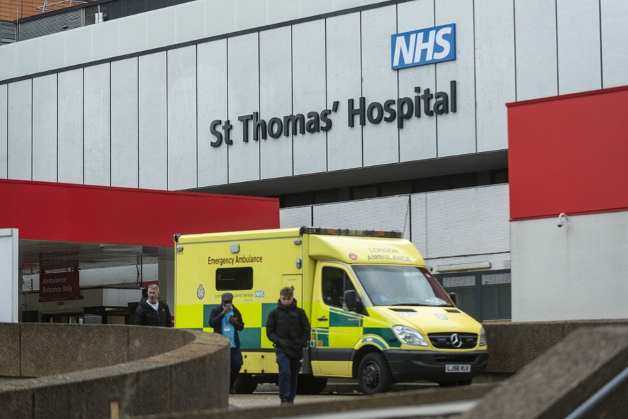 People pass an ambulance outside the emergency entrance at St Thomas' Hospital in London, Britain, on Nov. 9, 2021. (Photo by Stephen Chung/Xinhua)