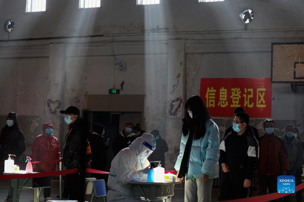 Medical workers take swab samples from citizens at a nucleic acid testing site in Xiangfang District of Harbin, northeast China's Heilongjiang Province, Nov. 15, 2021. Harbin started a new round of all-inclusive nucleic acid testing from 8 a.m. Monday to 8 a.m. Wednesday. The whole city will be downgraded to low-risk for COVID-19 if all samples collected come back negative. (Xinhua/Wang Jianwei)