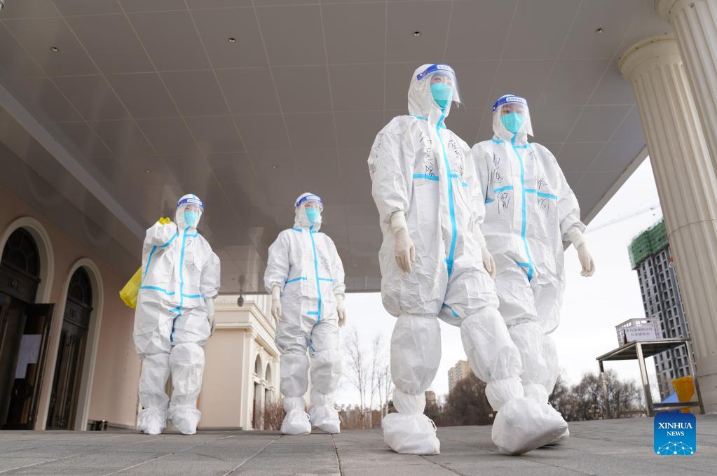 Medical workers walk to a nucleic acid test laboratory named Huoyan, or Fire Eye in Aihui District of Heihe City, northeast China's Heilongjiang Province, Nov. 15, 2021. "Huoyan" laboratory has significantly improved the city's COVID-19 testing capability. (Xinhua/Wang Song)