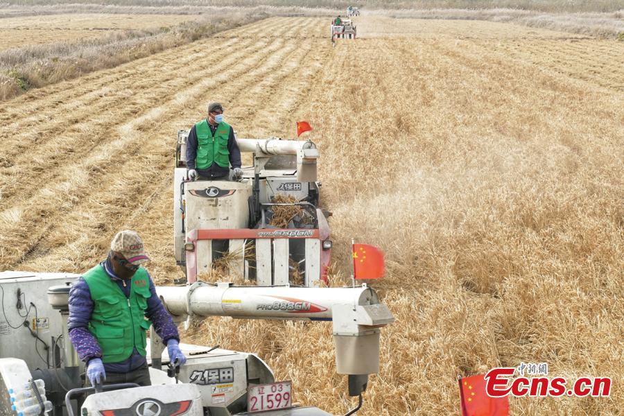 Workers harvest seawater rice developed by the late scientist Yuan Longping and his team at a planting base in Jinghai District, north China's Tianjin municipality, Nov. 15, 2021. (Photo: China News Service/Tong Yu)