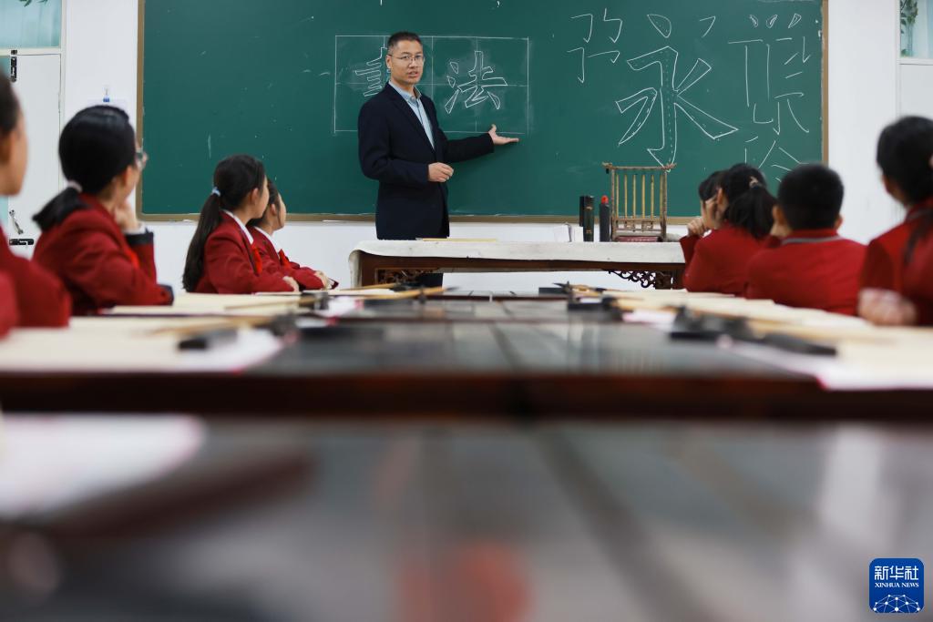 Photo taken on Nov. 16, 2021 shows students practicing calligraphy at Xinxiguan Primary School in Neiqiu County of Xingtai City, north China's Hebei Province. Students have various options for extra-curricular activities such as calligraphy, sports, and dance which aim to meet the needs of different students and promote their healthy development. (Xinhua/Liu Jidong)