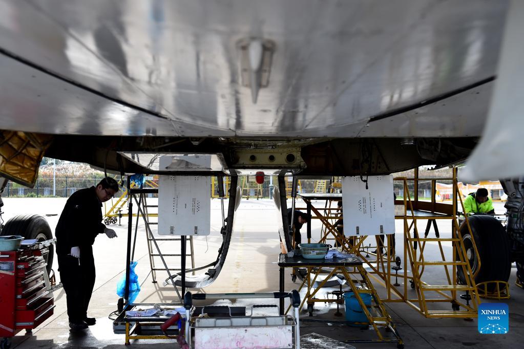 Technicians dismantle an aircraft at Hefei Xinqiao International Airport in Hefei, east China's Ahhui Province, Nov. 15, 2021. Technicians from Anhui Branch of China Eastern Airlines Technic Co., Ltd. have been dismantling a retired Airbus A320 aircraft, which has been in service for 22 years. Aircraft dismantling is a high-tech industrial project of circular economy, which is a measure to promote green and low-carbon development. (Xinhua/Huang Bohan)