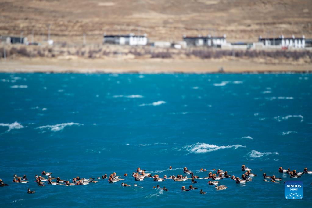 Photo taken on Nov. 16, 2021 shows birds swimming on the Yamzbog Yumco Lake in Shannan, southwest China's Tibet Autonomous Region. (Xinhua/Sun Fei)