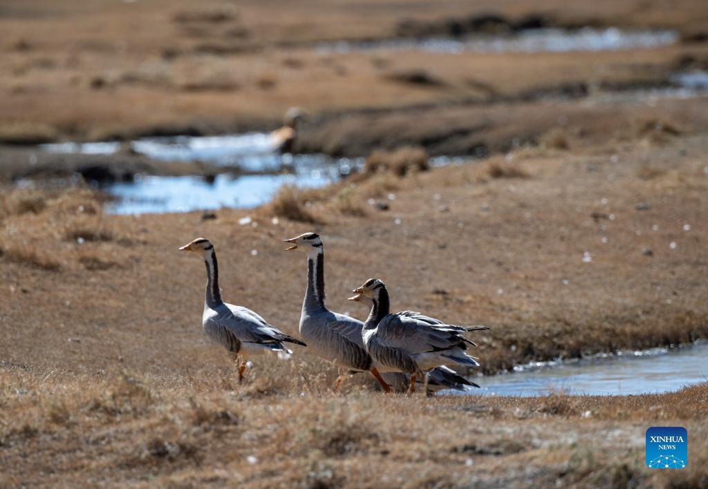 Bar-headed geese are seen at a wetland by the Yamzbog Yumco Lake in Shannan, southwest China's Tibet Autonomous Region, Nov. 16, 2021. (Xinhua/Sun Fei)