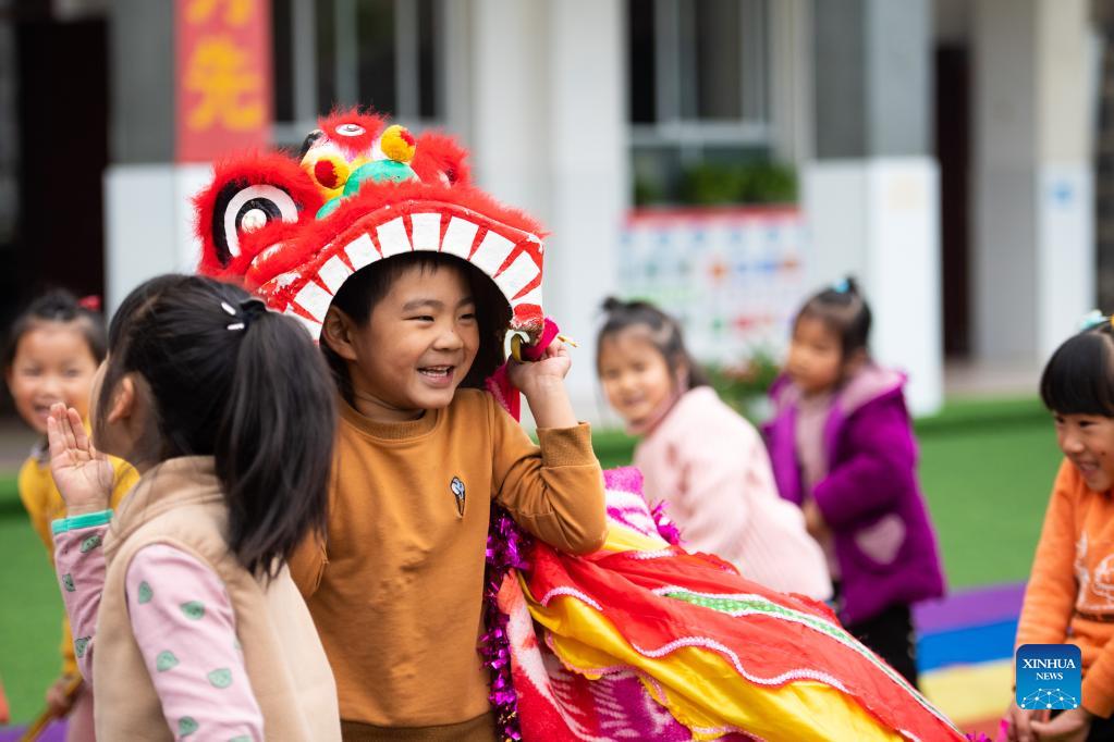 Children practice lion dance at a kindergarten in Yaotianping Town in Dingcheng District of Changde, central China's Hunan Province, Nov. 17, 2021. The kindergarten invited folk artists to give a dragon dance and lion dance lesson to the children, providing small kids an opportunity to have a close watch on the local intangible cultural heritage. (Xinhua/Chen Sihan)