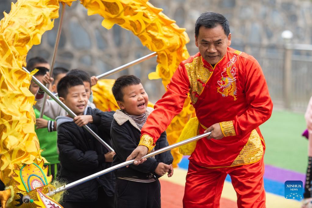 Children learn dragon dance from folk artist at kindergarten in Hunan
