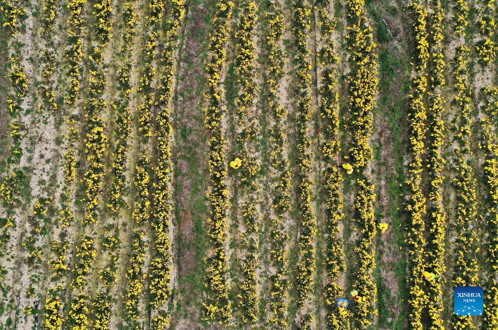 Aerial photo shows farmers picking mountain chrysanthemums in Hongxing Village of Nanchang, east China's Jiangxi Province, Nov. 16, 2021. Local farmers are busy with harvesting and processing chrysanthemum flowers in recent days. (Xinhua/Wan Xiang)