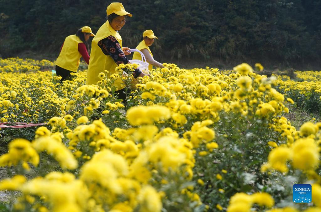 Farmers pick mountain chrysanthemums in Hongxing Village of Nanchang, east China's Jiangxi Province, Nov. 16, 2021. Local farmers are busy with harvesting and processing chrysanthemum flowers in recent days. (Xinhua/Wan Xiang)