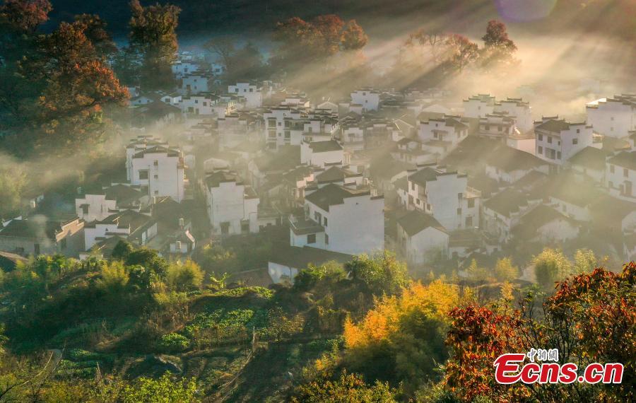 Maple leaves turn red in Shicheng village, East China's Jiangxi Province. Red leaves and white-and-gray-hued Hui-style architecture make a picturesque scenery. (Photo: China News Service/Hu Dunhuang)