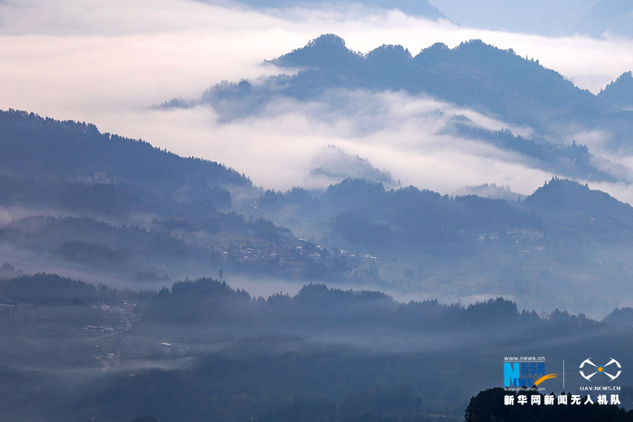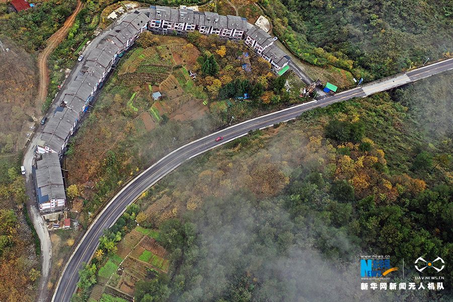 In early winter, the villages of Pengshui Miao-Tujia Autonomous County, southwest China's Chongqing, are shrouded in mist and clouds. Roads, fields, and villages are enveloped in a haze. In recent years, the local authority has vigorously promoted comprehensive improvement of the rural environment and the building of a beautiful countryside. Aerial view of the road next to Yingtao Villag of Runxi Township in the county shows a line of houses facing on to colourful trees on both sides of the road, making a picturesque rural scene. (Xinhuanet/ZhaoYong)