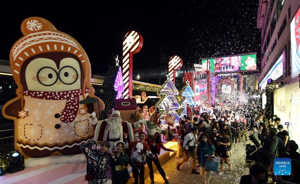 People attend a Christmas lighting ceremony at Harbour City shopping mall in south China's Hong Kong, Nov. 18, 2021. (Xinhua/Lo Ping Fai)