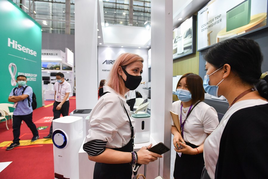 An Italian designer talks with household appliances exhibitors during the 130th session of the China Import and Export Fair, also known as the Canton Fair in Guangzhou, south China's Guangdong Province, Oct. 15, 2021. (Xinhua/Liu Dawei)