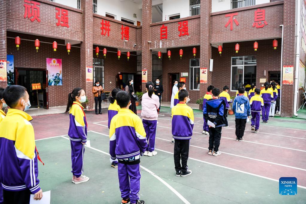 Pupils line up to get inoculated with the COVID-19 vaccines at Weiming elementary school in Weiming Village, Shinan Township, Xingye County, south China's Guangxi Zhuang Autonomous Region, Nov. 18, 2021. Local health authorities of Xingye County in Guangxi recently promoted the inoculation of the COVID-19 vaccine on children aged three to eleven in remote rural areas. (Xinhua/Cao Yiming)