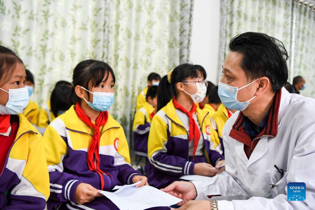A medical worker explains after-vaccination instructions to pupils after they get inoculated with the COVID-19 vaccines at Weiming elementary school in Weiming Village, Shinan Township, Xingye County, south China's Guangxi Zhuang Autonomous Region, Nov. 18, 2021. Local health authorities of Xingye County in Guangxi recently promoted the inoculation of the COVID-19 vaccine on children aged three to eleven in remote rural areas. (Xinhua/Cao Yiming)