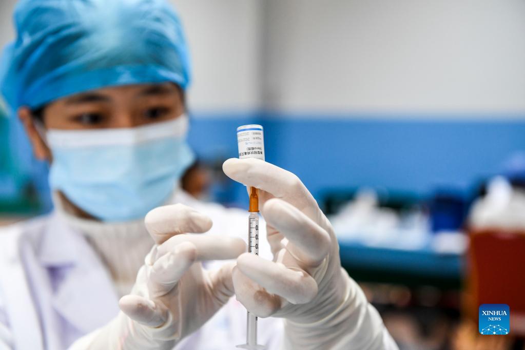 A medical worker prepares a dose of COVID-19 vaccine at a vaccination site in Pingxiang City, south China's Guangxi Zhuang Autonomous Region, Nov. 16, 2021. (Xinhua/Cao Yiming)