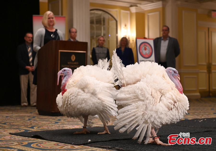 Two turkeys named Peanut Butter and Jelly are presented in Washington, D.C., the United States, Nov. 18, 2021. They will be pardoned by the U.S. President for the 2021 Thanksgiving Day. (Photo: China News Service/Chen Mengtong)