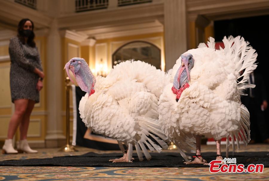 Two turkeys named Peanut Butter and Jelly are presented in Washington, D.C., the United States, Nov. 18, 2021. They will be pardoned by the U.S. President for the 2021 Thanksgiving Day. (Photo: China News Service/Chen Mengtong)