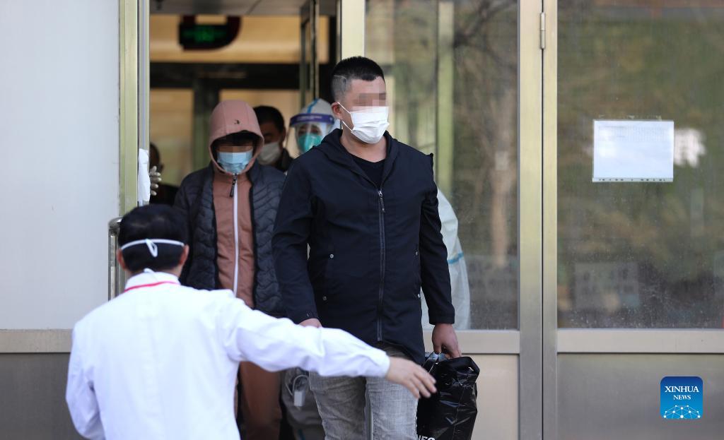 The cured patients walk out of the isolation ward in Dalian, northeast China's Liaoning Province, Nov. 19, 2021. The first batch of three patients and one asymptomatic person in the latest COVID-19 epidemic were discharged from hospital on Friday in Dalian. They will continue a 14-day isolated medical observation in designated hospitals. (Xinhua/Yao Jianfeng)