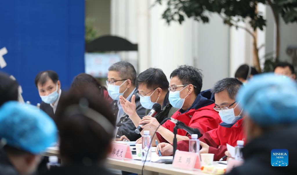 Members of the joint expert group conduct medical consultation in Dalian, northeast China's Liaoning Province, Nov. 19, 2021. The first batch of three patients and one asymptomatic person in the latest COVID-19 epidemic were discharged from hospital on Friday in Dalian. They will continue a 14-day isolated medical observation in designated hospitals. (Xinhua/Yao Jianfeng)