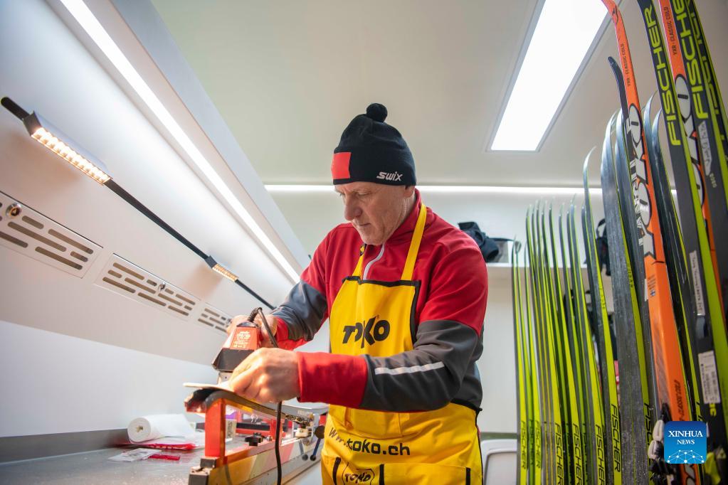 Waxing technician Terje Bjarte Langli works on a ski in the new waxing truck in Wenquan County, northwest China's Xinjiang Uygur Autonomous Region, Nov. 16, 2021. China's very first self-developed waxing truck was deployed during the Chinese national cross-country skiing team training session for the 2022 Olympic Winter Games. It comes with 6 waxing benches, cabins for storaging and other uses. (Xinhua/Hu Huhu)