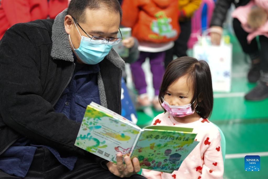 A man reads a picture book for a child after she received a dose of COVID-19 vaccine in Xicheng District of Beijing, capital of China, Nov. 19, 2021. Beijing has begun COVID-19 vaccination for children aged 3 to 11. (Xinhua/Peng Ziyang)
