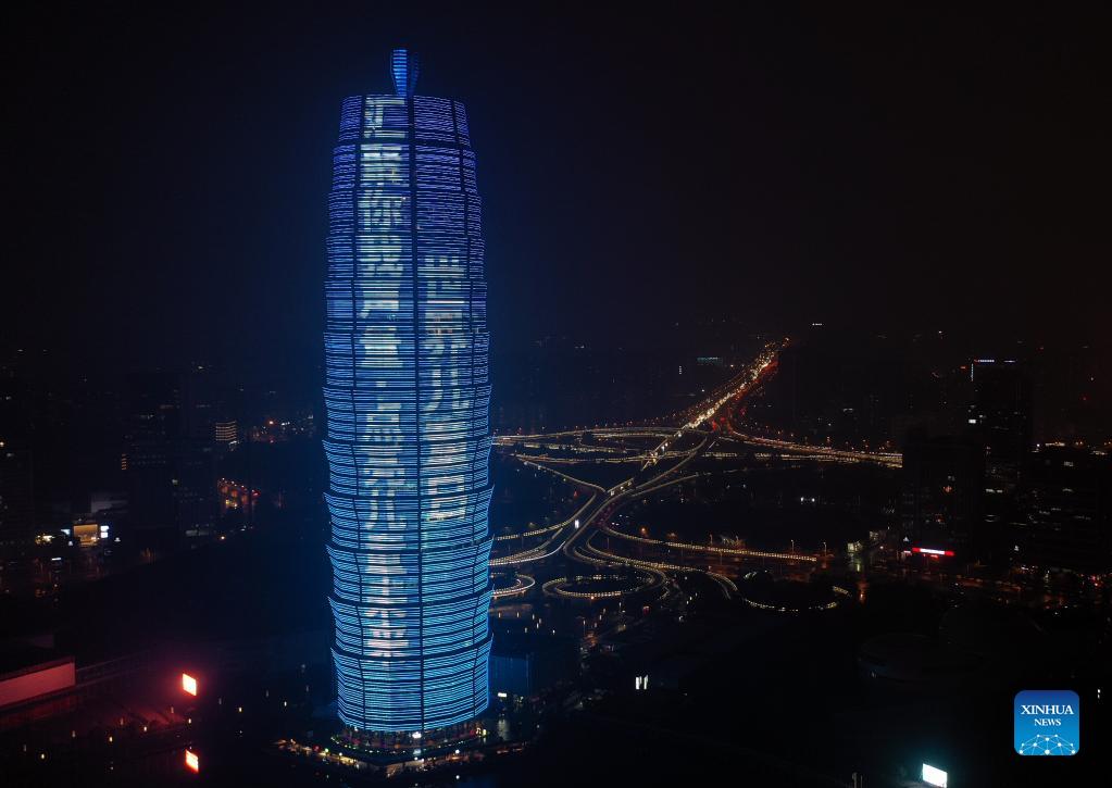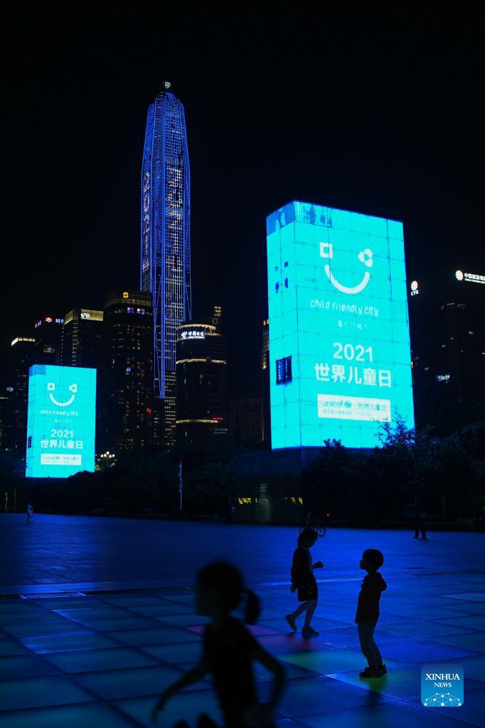 The Ping'an International Financial Center is lit up blue to celebrate World Children's Day in Shenzhen, south China's Guangdong Province, Nov. 20, 2021. A total of 23 Chinese cities on Saturday lit iconic buildings and monuments blue, including a section of the Great Wall of China, to mark World Children's Day. The celebration, hosted by UNICEF, was livestreamed due to COVID-19 and called on society as a whole to unite for girls' and boys' rights to health, education, protection and participation. World Children's Day commemorates the adoption of the Convention on the Rights of the Child on Nov. 20, 1989. China ratified the convention in 1992. (Xinhua/Liang Xu)