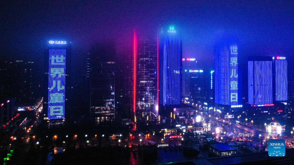 Aerial photo taken on Nov. 20, 2021 shows buildings lit up blue to celebrate World Children's Day in Guanshanhu District of Guiyang, southwest China's Guizhou Province. A total of 23 Chinese cities on Saturday lit iconic buildings and monuments blue, including a section of the Great Wall of China, to mark World Children's Day. The celebration, hosted by UNICEF, was livestreamed due to COVID-19 and called on society as a whole to unite for girls' and boys' rights to health, education, protection and participation. World Children's Day commemorates the adoption of the Convention on the Rights of the Child on Nov. 20, 1989. China ratified the convention in 1992. (Xinhua/Ou Dongqu)