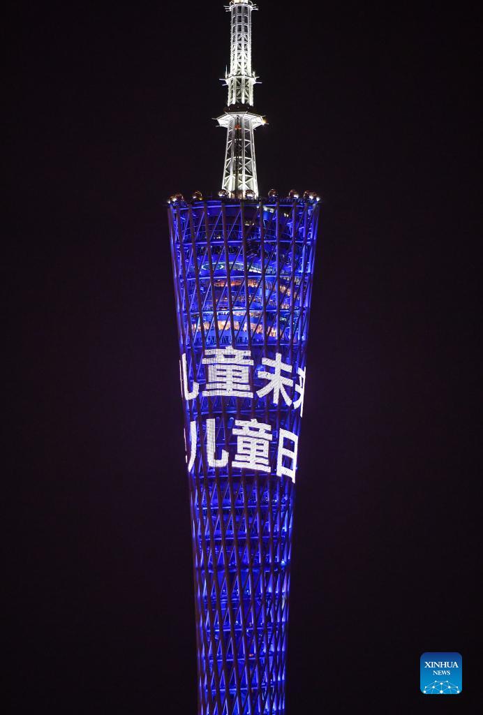 Canton Tower is lit up blue to celebrate World Children's Day in Guangzhou, south China's Guangdong Province, Nov. 20, 2021. A total of 23 Chinese cities on Saturday lit iconic buildings and monuments blue, including a section of the Great Wall of China, to mark World Children's Day. The celebration, hosted by UNICEF, was livestreamed due to COVID-19 and called on society as a whole to unite for girls' and boys' rights to health, education, protection and participation. World Children's Day commemorates the adoption of the Convention on the Rights of the Child on Nov. 20, 1989. China ratified the convention in 1992. (Xinhua/Liu Dawei)