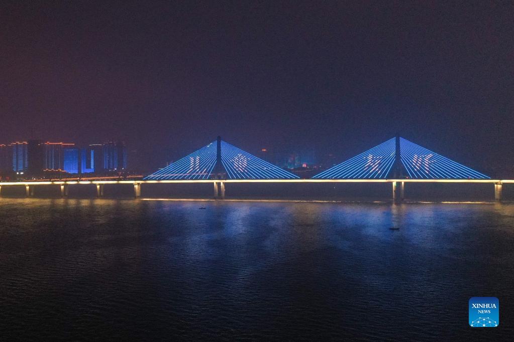 Aerial photo taken on Nov. 20, 2021 shows the Yinpenling Bridge lit up blue to celebrate World Children's Day in Changsha, central China's Hunan Province. A total of 23 Chinese cities on Saturday lit iconic buildings and monuments blue, including a section of the Great Wall of China, to mark World Children's Day. The celebration, hosted by UNICEF, was livestreamed due to COVID-19 and called on society as a whole to unite for girls' and boys' rights to health, education, protection and participation. World Children's Day commemorates the adoption of the Convention on the Rights of the Child on Nov. 20, 1989. China ratified the convention in 1992. (Xinhua/Xue Yuge)