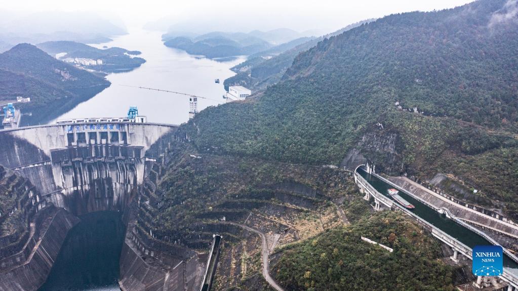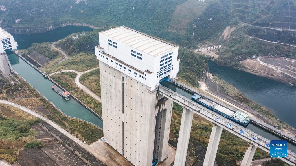 Aerial photo taken on Nov. 17, 2021 shows a cargo ship loaded with phosphate ore sailing through a dam on the Wujiang River in southwest China's Guizhou Province. The Wujiang River waterway in Guizhou, which had been cut off for nearly 20 years due to the construction of hydropower stations along the river, has fully resumed to traffic recently. (Xinhua/Tao Liang)
