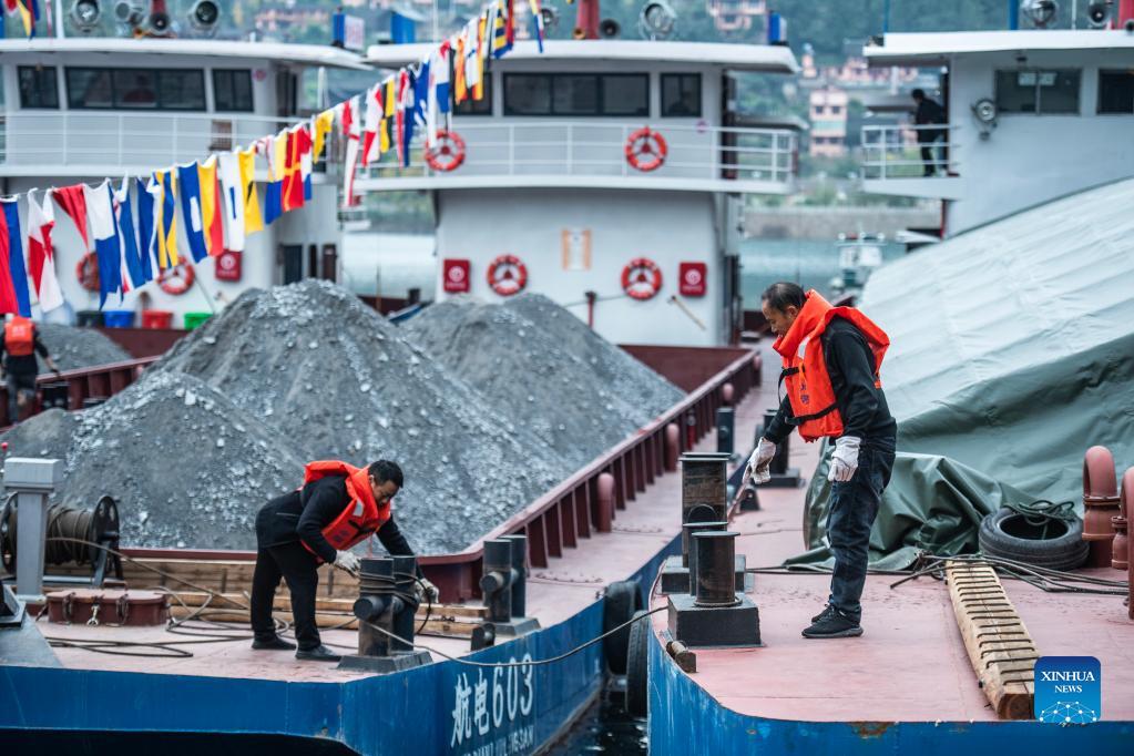 A cargo ship loaded with phosphate ore prepares to leave a pier in Guiyang, southwest China's Guizhou Province, Nov. 16, 2021. The Wujiang River waterway in Guizhou, which had been cut off for nearly 20 years due to the construction of hydropower stations along the river, has fully resumed to traffic recently. (Xinhua/Tao Liang)