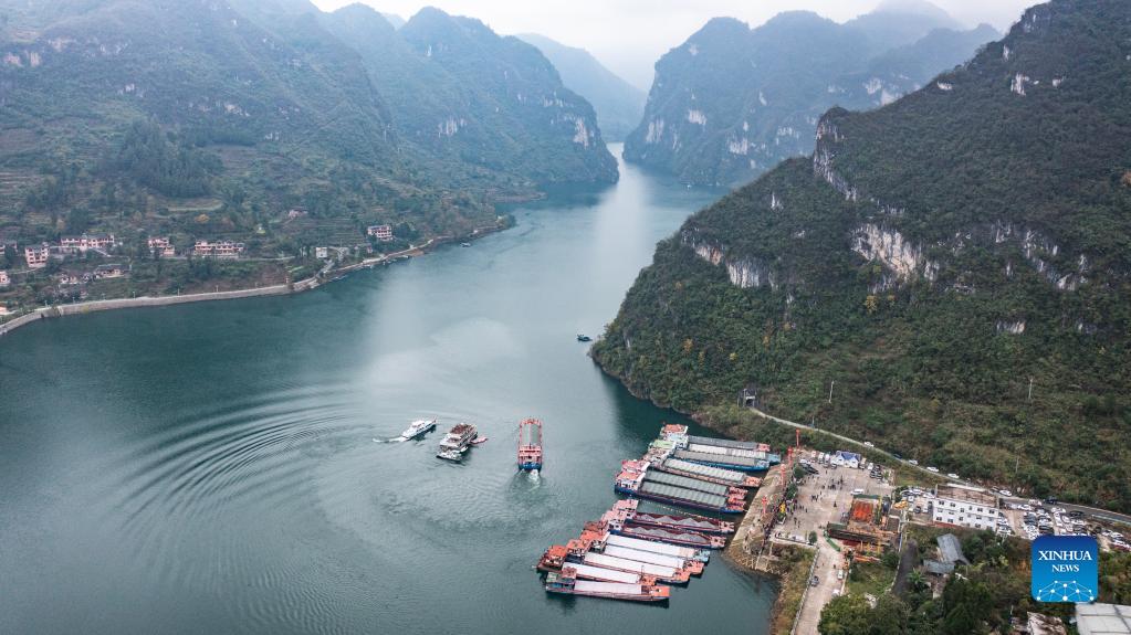 Aerial photo taken on Nov. 19, 2021 shows cargo ships loaded with phosphate ore sailing on the Wujiang River in Sinan County, southwest China's Guizhou Province. The Wujiang River waterway in Guizhou, which had been cut off for nearly 20 years due to the construction of hydropower stations along the river, has fully resumed to traffic recently. (Xinhua/Tao Liang)