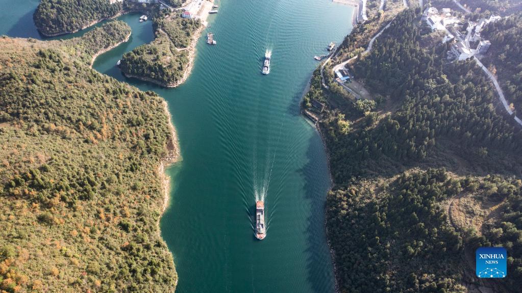 Aerial photo taken on Nov. 18, 2021 shows cargo ships loaded with phosphate ore sailing on the Wujiang River in Shiqian County, southwest China's Guizhou Province. The Wujiang River waterway in Guizhou, which had been cut off for nearly 20 years due to the construction of hydropower stations along the river, has fully resumed to traffic recently. (Xinhua/Tao Liang)